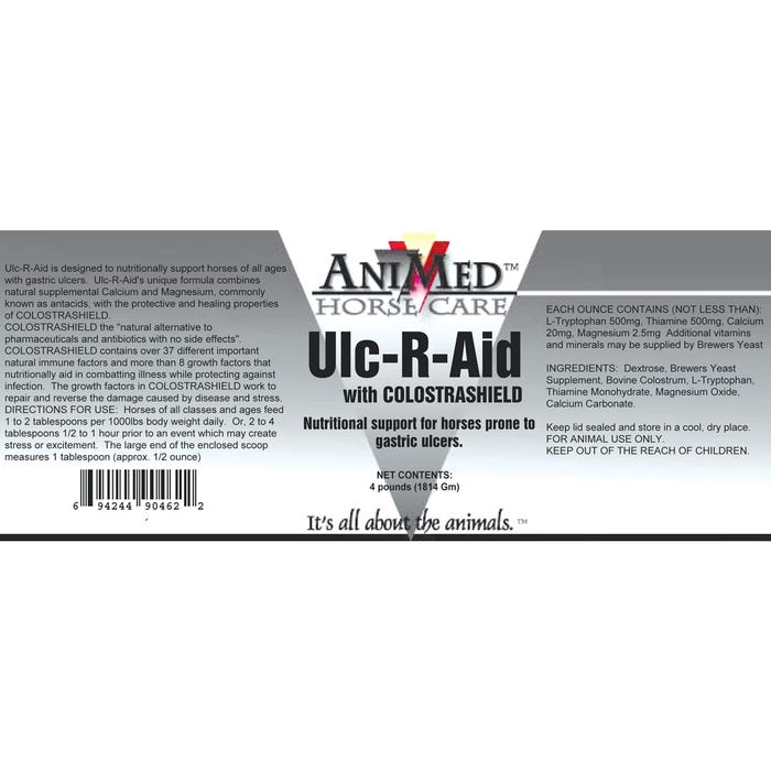 Ulc-R-Aid is designed to nutritionally support horses of all ages that have gastric ulcers. Ulc-R-Aid’s formula combines natural supplemental calcium and magnesium, commonly known as antacids, with the protective healing properties of Colostrashield.