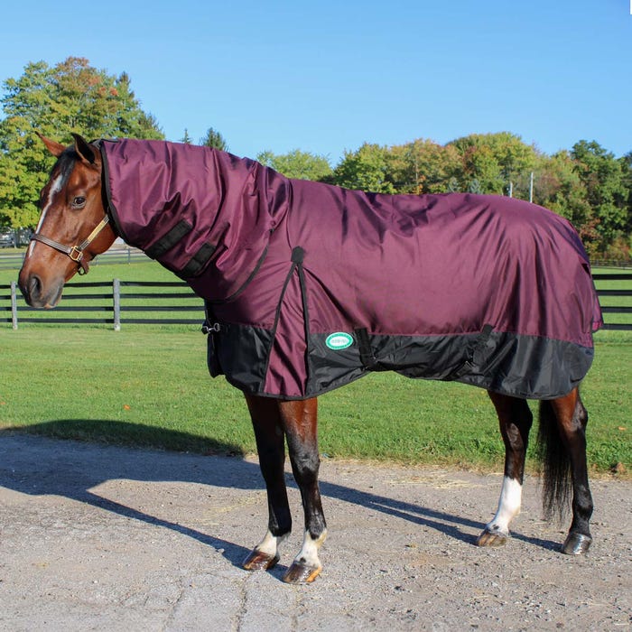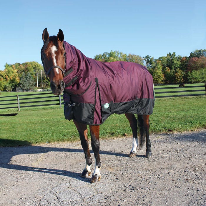 Midweight turnout blanket by Country Pride. Made of durable 1680D outer shell to keep your horse dry this winter season. Great for chilly days and nights, this Gale Force blanket features 200g of polyfill insulation. Easy pull hook and loop closures on the neck cover for adjustability and double buckle open front snaps on the chest. Dual belly surcingle straps to keep the blanket firmly in place during turnout. Shoulder gussets for freedom of movement and a tail flap to protect against the wind. Comes with adjustable/removable hind leg straps. Purple and Black two tone color.