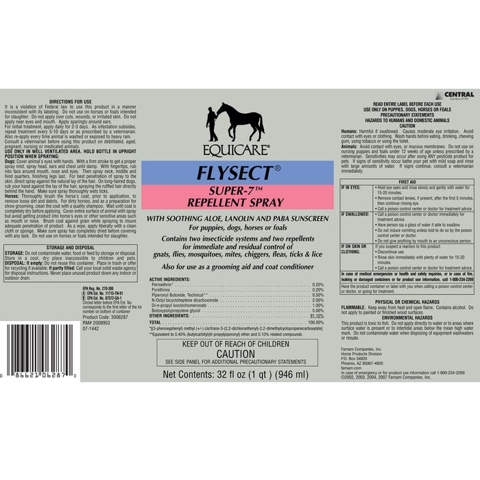 Flysect Super 7 Repellent Spray – Insect Protection & Coat Conditioning. Flysect Super 7 Repellent Spray by Equicare is designed to help manage insects while supporting coat health in horses, foals, dogs, and puppies. This versatile formula combines two insect control agents and two repellents, offering broad-spectrum protection. Enriched with aloe and lanolin, it also moisturizes the skin and enhances coat shine, while PABA sunscreen provides an extra layer of defense against harmful UV rays.