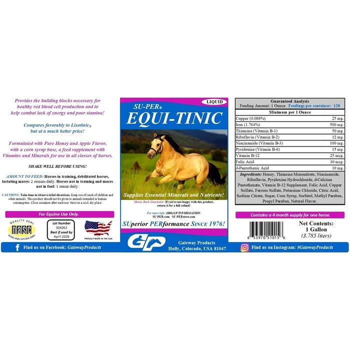 Su-Per Equi-Tinic Liquid by Gateway Products is a cost-effective alternative to Lixotinic, designed to provide comprehensive vitamin and mineral support for horses. This palatable, honey and apple-flavored liquid supplement includes iron, copper, B-complex vitamins, and other essential nutrients to support overall health and vitality. Ideal for horses in training, those recovering from illness, and lactating mares, Su-Per Equi-Tinic ensures your equine athlete receives vital nutrients in a highly digestible form.
